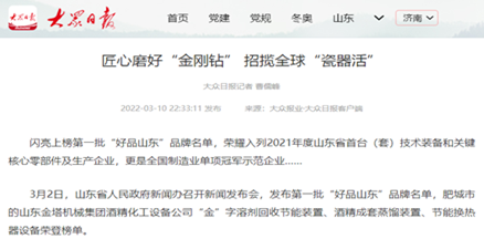 早春三月增春意,金塔品牌添春色。 3月2日,山東省人民政府新聞辦召開新聞發(fā)布會,發(fā)布第一批“好品山東”品牌名單,共涵蓋14類,223家制造業(yè)、消費(fèi)品、農(nóng)產(chǎn)品領(lǐng)域品牌。首批入選品牌具有質(zhì)量水平高、社會知名度高、市場影響力大的鮮明特點(diǎn)。山東金塔機(jī)械集團(tuán)酒精化工設(shè)備公司“金”字溶劑回收節(jié)能裝置、酒精成套蒸餾裝置、節(jié)能換熱器設(shè)備榮登榜單。 好品質(zhì)鑄就好品牌。金塔集團(tuán)致力以品質(zhì)金塔建設(shè)推進(jìn)品牌強(qiáng)力提升,產(chǎn)品相繼榮獲山東優(yōu)質(zhì)品牌、山東知名品牌稱號,被授予“山東省制造業(yè)高端品牌培育企業(yè)”。品質(zhì)卓越,品牌彰顯,金塔品牌知名度、美譽(yù)度和公信力得到完美展現(xiàn),成為推進(jìn)高質(zhì)量發(fā)展的強(qiáng)大引擎。